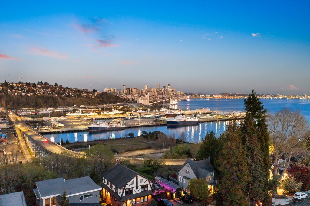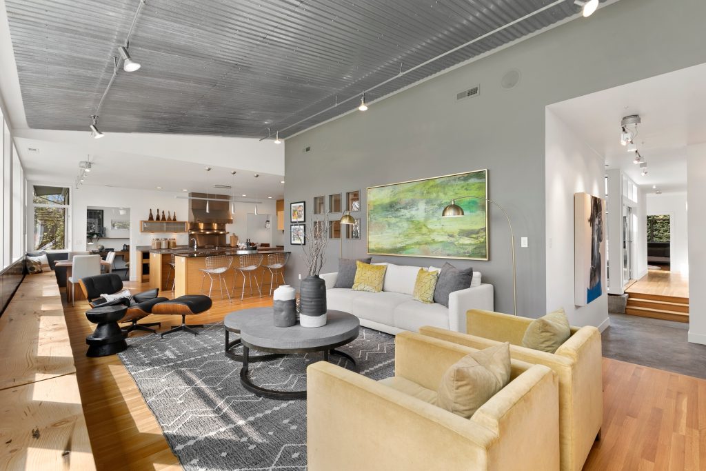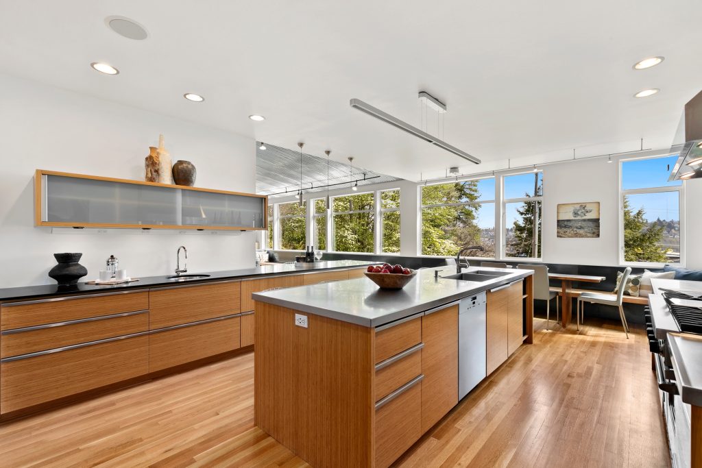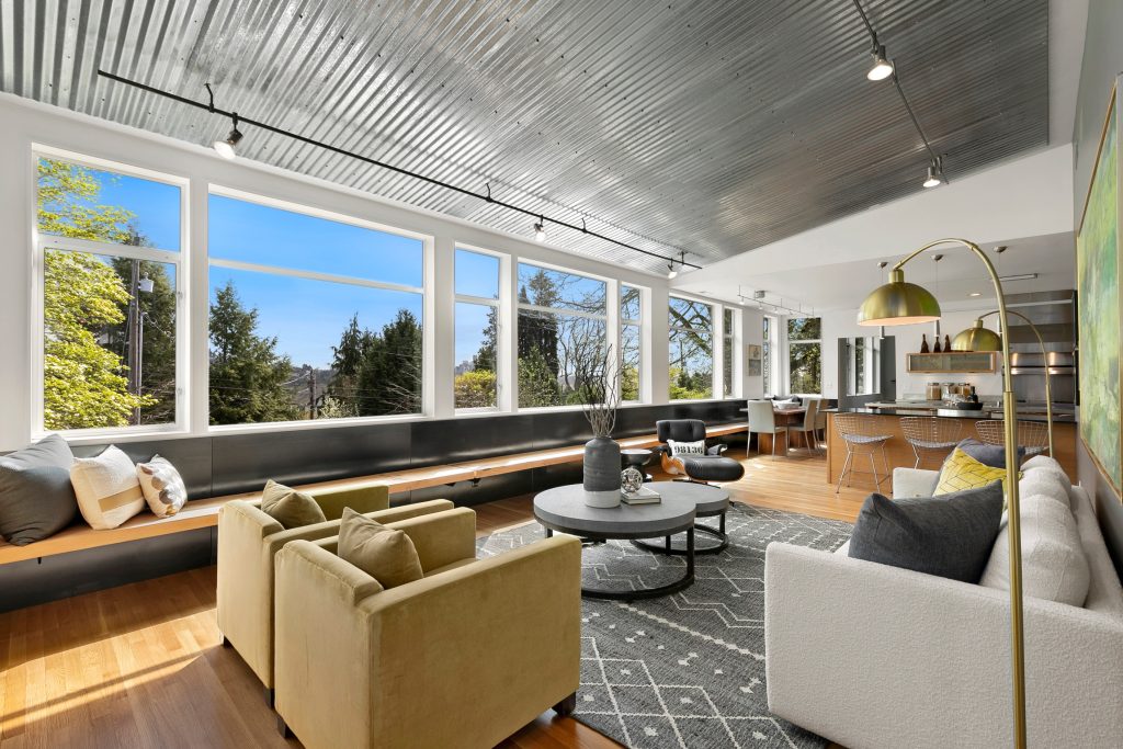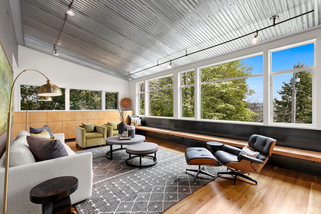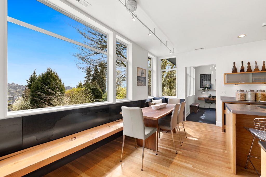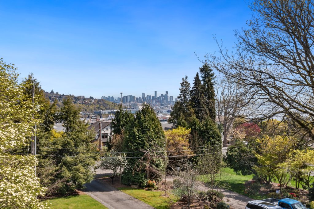 Located in the coveted Magnolia neighborhood, this beautifully modern, fully updated residence offers an exceptional blend of luxury, comfort, and natural privacy—positioned in a setting that feels quietly removed, almost like its own private street. Expansive living spaces with soaring ceilings are complemented by softly framed outlooks of the city skyline and Mount Rainier, subtly unveiled through a backdrop of mature trees, creating a rare sense of seclusion while preserving the beauty of the surroundings. Walls of windows fill the home with natural light, highlighting the refinished hardwood floors. The gourmet kitchen is a statement of elegance, featuring premium stainless steel appliances and a sleek stainless steel countertop, seamlessly connecting to a spacious dining room and a refined private office just beyond.